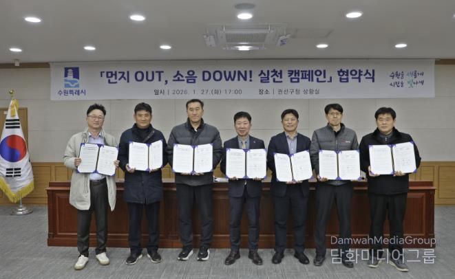 수원시 권선구는 지난 1월 27일 구청 상황실에서 관내 대형공사장 6개소와 비산먼지 및 소음 저감을 위한 ‘먼지 OUT, 소음 DOWN! 실천 캠페인’ 자율 실천 협약식을 개최했다.