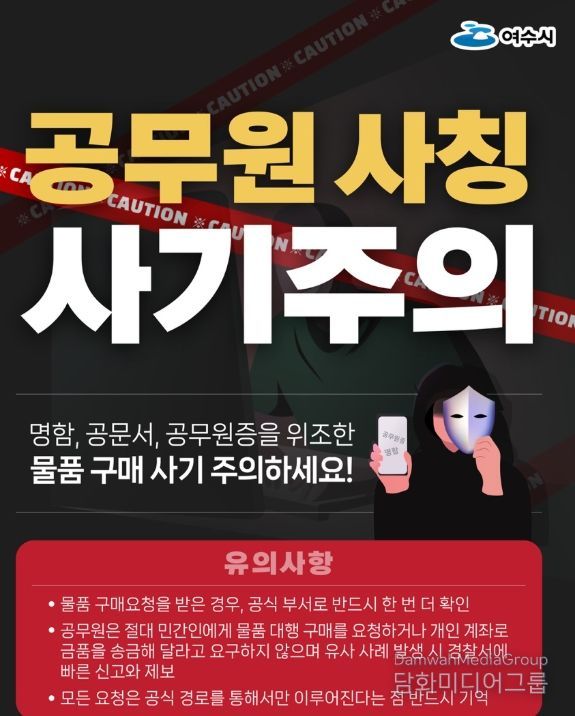 여수시 관계자는 “공무원은 어떠한 경우에도 민간인에게 대리 구매나 개인 계좌 송금을 요구하지 않는다”며, “의심스러운 요구가 있을 경우 반드시 해당 부서에 교차 확인하고, 조금이라도 이상하다면 즉시 경찰(112)에 신고해 달라”고 당부했다.