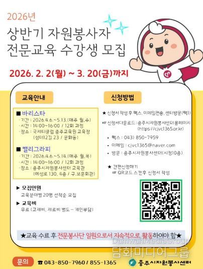 시민행정신문 강갑수 기자 | 충주시자원봉사센터(센터장 심영자)는 지역사회 자원봉사활동 활성화 및 봉사자의 전문성 강화를 위한 2026년 상반기 자원봉사자 전문교육을 실시한다.