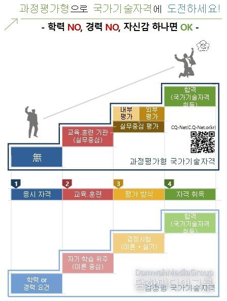 또한, 교육·훈련을 통해 실무 역량을 키워나가는 만큼 별도의 응시자격을 먼저 요구하지 않아 경력이 없는 사람이나 비전공자도 산업기사 이상 자격에 도전할 수 있다. 과정평가형 국가기술자격을 취득하기 위해서는 직업계고, 대학, 폴리텍 등 교육기관에서 개설되는 과정에 참여하거나, 직업훈련기관에서 국민내일배움카드로 교육·훈련을 신청하여 수강할 수 있다.