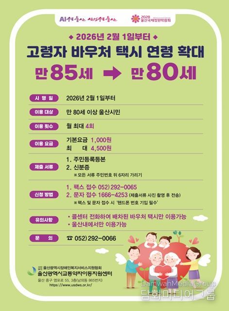 시민행정신문 기자 | 울산시는 오는 2월 1일부터 교통약자(임산부, 영아, 고령자) 이용권(바우처) 택시 이용 고령자 대상을 만 85세에서 만 80세 이상으로 확대한다고 밝혔다.