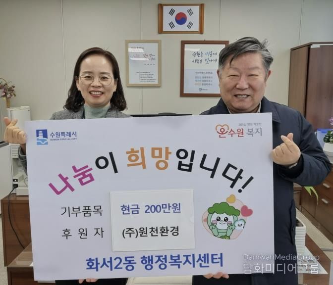 시민행정신문 강갑수 기자 | 수원시 팔달구 화서2동 행정복지센터는 최근 관내 폐기물 수거업체 원천환경이 어려운 이웃을 위해 사용해 달라며 이웃돕기 성금 200만 원을 기탁했다고 밝혔다.