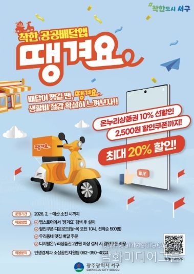 시민행정신문 강갑수 기자 | 광주광역시 서구가 골목경제 활성화를 위해 공공배달앱 할인쿠폰 지원사업을 본격 시행한다. 서구는 오는 2월부터 공공배달앱 ‘땡겨요’ 이용 시 사용할 수 있는 2500원 할인쿠폰을 하루 500매씩 발행한다고 밝혔다.