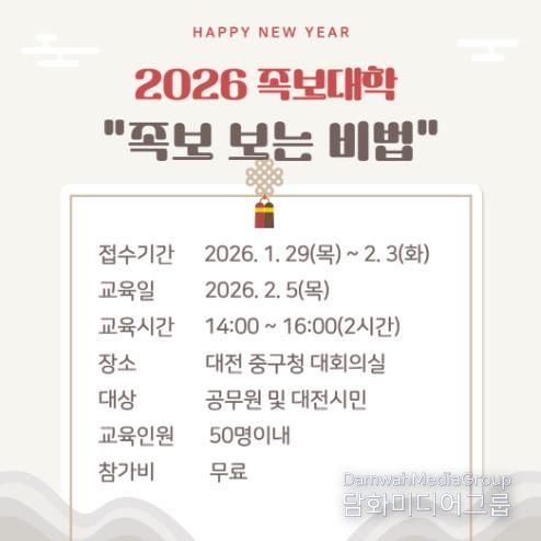 이번 교육은 오는 2월 5일 오후 2시부터 4시까지 중구청 대회의실에서 대전 시민 및 공무원 50명을 대상으로 무료로 진행된다.
