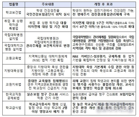 지역혁신중심 대학지원체계(RISE, 이하 라이즈)의 법적 기반 확립을 주요 내용으로, '고등교육법'과 '지방대육성법'('지방대학 및 지역균형인재 육성에 대한 법률')을 개정했다.