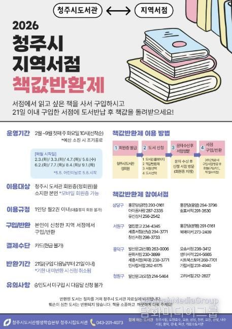 시민행정신문 강갑수 기자 | 청주시는 지역 서점과 협력해 시민의 독서 참여를 확대하고 지역 상권 활성화를 도모하는 ‘책값반환제’를 2월 3일부터 운영한다고 30일 밝혔다.