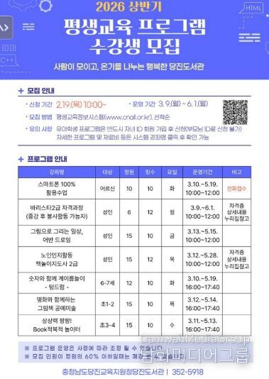 정은영 교육장은 “마을교사는 지역의 소중한 교육자원으로서 학생들이 삶과 배움을 연결해 성장할 수 있도록 돕는 중요한 역할을 맡고 있다”며 “당진창의체험학교를 통해 학교 교육과정이 지역과 더욱 긴밀히 연계되고, 학생들의 창의성과 공동체 역량이 함께 자라나길 기대한다”고 밝혔다.
