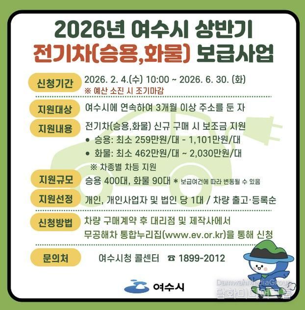접수 기간은 2월 4일부터 시작되며 자세한 사항은 여수시청 누리집 고시공고 또는 무공해차 통합누리집에서 확인할 수 있다.