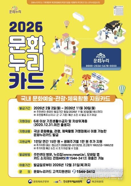 아울러 2025년도 문화누리카드를 3만 원 이상 사용하고 2026년에도 수급자격을 유지하는 경우, 별도의 신청 절차 없이 보유한 카드에 지원금이 자동 충전되어 사용 가능하다.