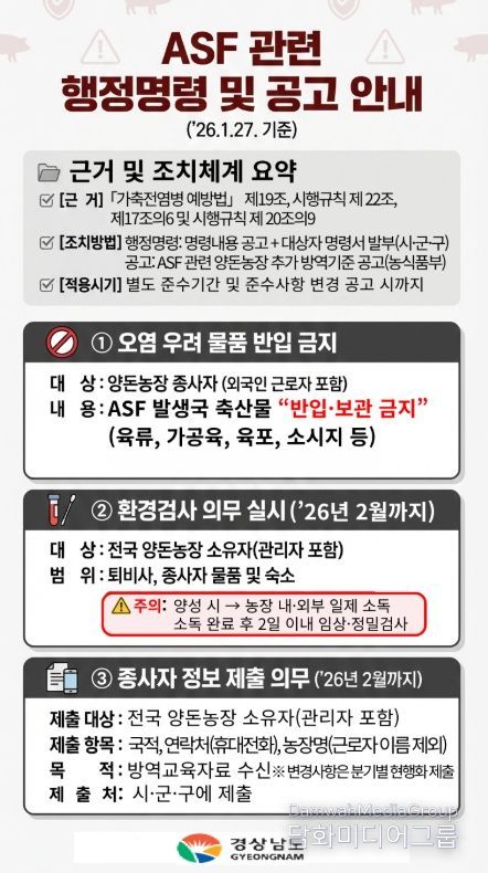 시민행정신문 기자 | 경상남도는 전남 영광 종돈장에서 아프리카돼지열병(ASF)이 발생하는 등 전국적으로 확산 우려가 커짐에 따라, 도내 모든 양돈농장과 축산시설을 대상으로 고강도 방역 대책을 추진한다고 밝혔다.