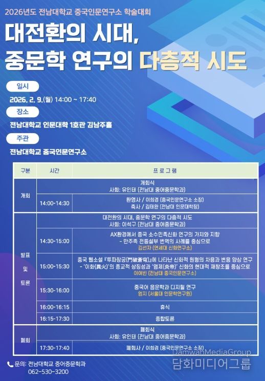 전남대학교 중국인문연구소는 오는 2월 9일, 전남대학교 김남주홀에서 ‘대전환의 시대, 중문학 연구의 다층적 시도’를 주제로 2026년도 학술대회를 개최한다.