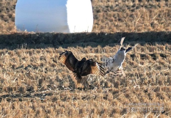 윤 작가는 “당시 참매가 사냥한 먹이(흰뺨검둥오리 추정) 일부를 먹기 시작하던 가운데 말똥가리가 날아와 먹이를 차지하려 두 맹금류 간 다툼이 짧게 발생했다”고 설명했다.