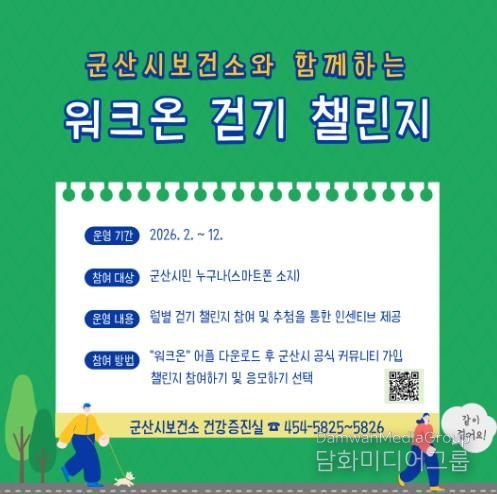 시민행정신문 강갑수 기자 | 군산시보건소가 모바일 걷기 앱 ‘워크온(WalkOn)’을 활용한 월별 걷기 챌린지를 2월부터 12월까지 운영할 예정이라고 밝혔다.