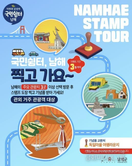 시민행정신문 강갑수 기자 | 남해군은 남해를 찾는 관외 거주 여행객들에게 색다른 즐거움을 제공하고 지역 관광에 활력을 불어넣기 위해 ‘국민쉼터 남해, 찍고 가요~’ 스탬프 투어를 3월(기념품 소진 시 조기 종료 가능)까지 시행한다고 밝혔다.
