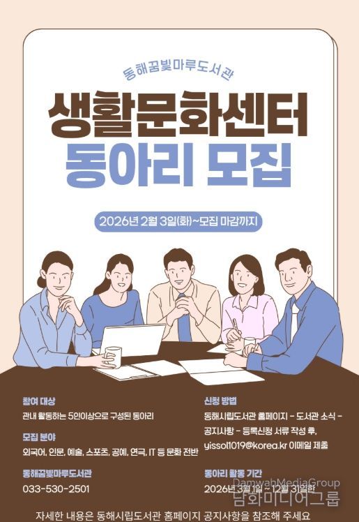 시민행정신문 강갑수 기자 | 동해시는 시민들이 동아리(소모임) 활동을 통해 취미와 취향을 발견하고, 지역사회 전반에 자발적인 생활문화가 확산될 수 있도록 '2026년도 꿈빛마루 생활문화센터 동아리 모집'을 시행한다고 밝혔다.