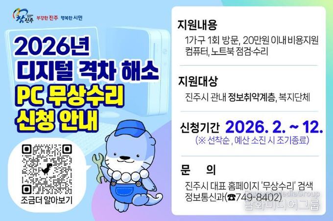 시민행정신문 강갑수 기자 | 진주시는 정보 취약계층의 디지털 격차를 해소하기 위해 ‘컴퓨터(PC) 무상수리 지원사업’ 신청을 받는다고 밝혔다.