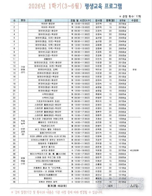 이번 학기에는 공모를 통해 선정된 46개 프로그램과 지역 우수강사의 재능을 활용한 12개 재능기부 프로그램 등 총 58개 강좌를 운영한다. 교육 과정은 영어 및 컴퓨터 등 기초문해 과정, 요리 및 동화구연지도사 등 직업능력·인문교양 과정, 통기타·민화·태극권 등 문화예술 과정으로 구성했다. 상반기 교육은 3월 3일부터 6월 29일까지 17주간 진행할 예정이다.