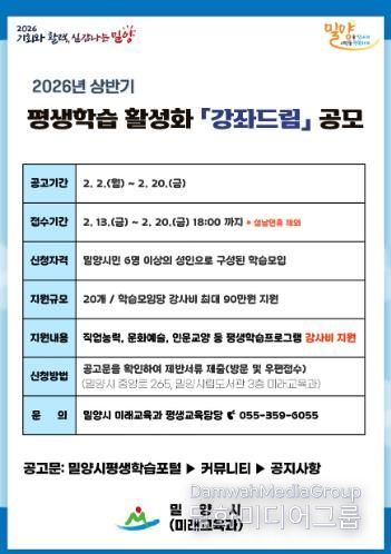 시민행정신문 강갑수 기자 | 경남 밀양시는 시민이 원하는 시간과 장소에 맞춤형 평생학습 프로그램을 제공하는 2026년 상반기 평생학습 활성화 사업 ‘강좌드림’의 공모를 추진하고, 오는 13일부터 신청을 받는다고 밝혔다.