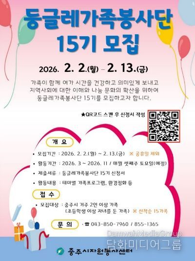 시민행정신문 강갑수 기자 | 충주시자원봉사센터(센터장 심영자)는 관내에 거주하는 초등학생 이상 자녀를 둔 2인 이상 가족을 대상으로 15기 둥글레가족봉사단으로 활동할 15가족을 선착순 모집한다.