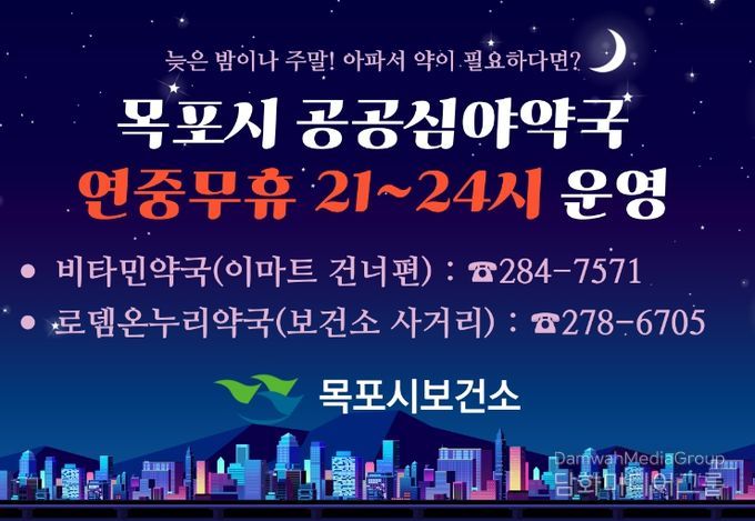 현재 목포시는 공공심야약국 2개소를 지정·운영하고 있다. 이마트 인근의 ‘비타민약국’(옥암동)은 2021년부터, 보건소 사거리 인근의 ‘로뎀온누리약국’(산정동)은 2023년부터 공공심야약국으로 지정돼 심야시간대 의약품 제공과 전문적인 복약지도를 실시하고 있다.