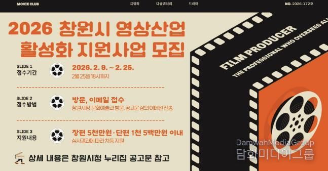 시민행정신문 강갑수 기자 | 창원특례시는 지역의 문화산업 경쟁력을 강화하고 창원에 기반하고 있는 영상물 제작자들의 창작활동을 지원하기 위해 ‘2026년 영상산업 지원사업’ 공모 접수를 오는 2월 9일부터 2월 25일까지 진행한다고 밝혔다.