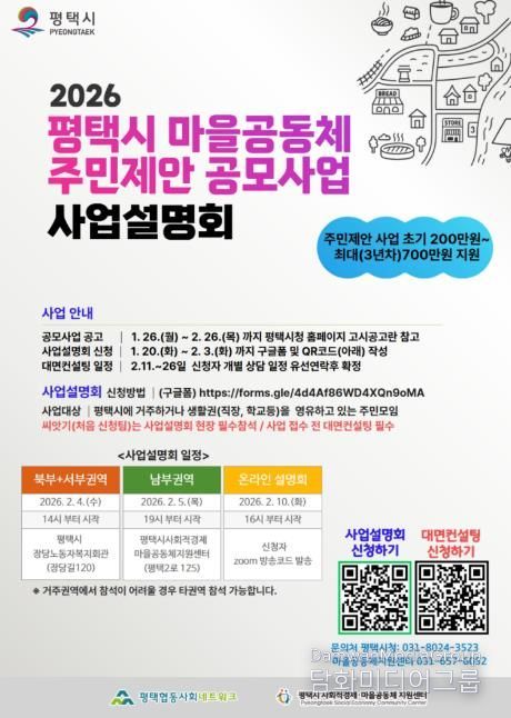 시민행정신문 강갑수 기자 | 평택시는 주민들이 스스로 만들어가는 만남과 소통의 마을공간에서 지속 가능한 공동체 활동을 지원하고자, 지난 27일부터 녪년 평택시 마을공동체 주민제안 공모사업’을 추진한다고 밝혔다.