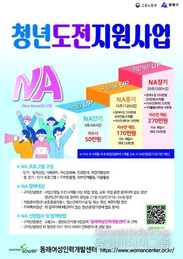 청년 도전 지원 사업은 상시 모집으로 진행되며, ‘NA(Not Alone)의 시작’을 함께하고 싶은 청년은 동래여성인력개발센터로 문의하면 된다.