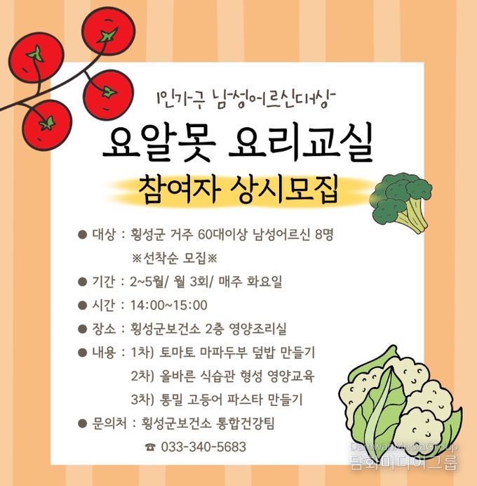 시민행정신문 기자 | 횡성군은 1인가구 남성 어르신의 건강한 식생활 형성과 영양관리 강화를 위해 2월부터 5월까지 “요알못(요리를 알지 못하는) 영양교실”을 운영한다.
