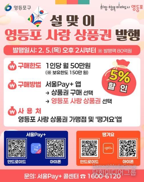 시민행정신문 강갑수 기자 | 영등포구가 새해를 맞아 위축된 소비 심리를 회복하고 지역 내 소상공인의 매출 증대를 돕기 위해 오는 2월 5일 오후 2시부터 총 80억 원 규모의 ‘영등포 사랑상품권’을 발행한다고 밝혔다.