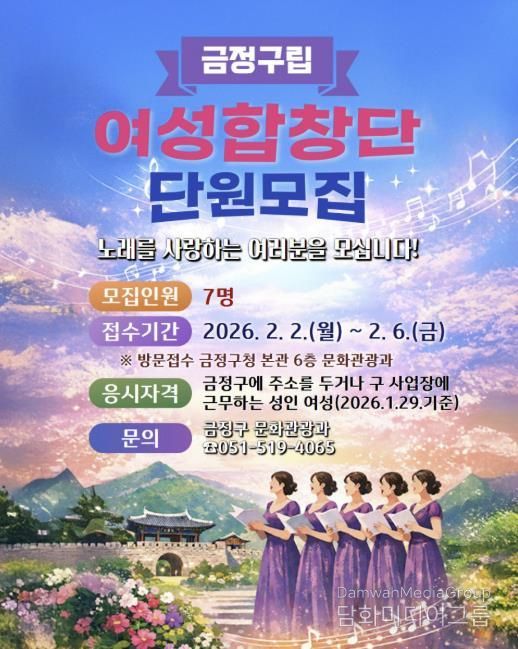 시민행정신문 강갑수 기자 | 부산 금정구는 금정구 문화예술 발전에 기여하고 수준 높은 공연 문화를 이끌어 갈 금정구립 여성합창단 단원을 모집한다고 2일 밝혔다.