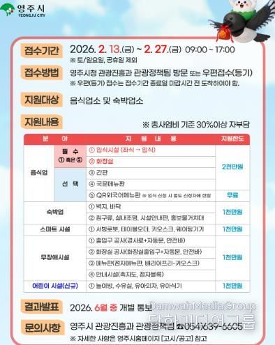 시민행정신문 강갑수 기자 | 영주시는 오는 2월 13일부터 27일까지 관내 음식업소와 숙박업소를 대상으 ‘2026년 관광서비스 시설환경개선사업’ 참여 업체를 모집한다.