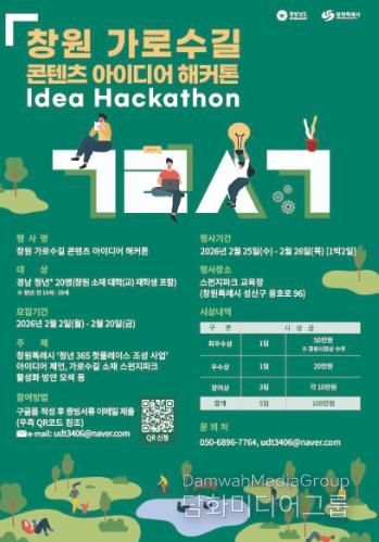 시민행정신문 강갑수 기자 | 창원특례시는 ‘청년 365 핫플레이스 조성 사업’의 일환으로 2026년 2월 25일부터 26일까지 이틀간 스펀지파크 교육장(창원시 성산구 용호로 96)에서 '창원 가로수길 콘텐츠 아이디어 해커톤' 을 개최한다고 밝혔다.