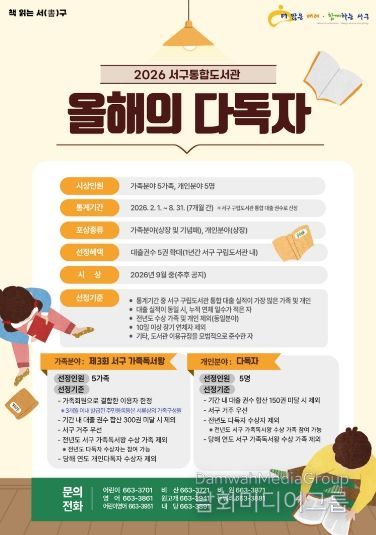선정된 개인 다독자 5명과 다독 가족 5가정에는 ‘2026년 제5회 북&평생학습 축제’ 행사 시 상장이 수여될 예정이며, 선발 이후 1년간 도서 대출 권수 확대 혜택이 제공된다.