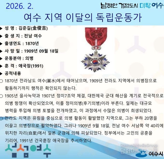 시민행정신문 강갑수 기자 | 여수시는 2026년 2월의 독립운동가로 여수 출신 ‘김준길(金俊吉)’ 선생을 선정했다.