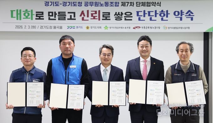 김동연 경기도지사와 김진경 경기도의회 의장, 강순하 경기도청공무원 노동조합 위원장, 백승진 경기도통합공무원노동조합 위원장, 최형곤 전국공무원노동조합 경기도청지부 사무국장은 3일 경기도청 율곡홀에서 제7차 단체협약서에 서명했다.