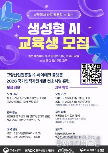 시민행정신문 이세훈 기자 | 고양산업진흥원 산하 K-하이테크플랫폼 지원단이 ‘2026년 실무에서 바로 쓰는 생성형 AI 과정’ 교육생을 모집한다.