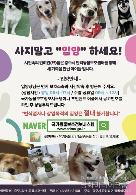 입양 상담은 중앙탑면 반려동물보호센터에서 평일 9시~17시, 주말‧공휴일 9시~12시에 가능하며, 방문 전 보호소와 조율 후 방문해야 한다.