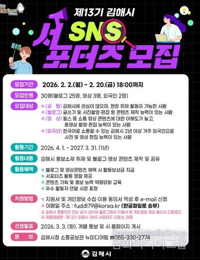 시민행정신문 강갑수 기자 | 김해시는 시정의 다양한 소식을 생동감 있게 전해줄 제13기 김해시 SNS 서포터즈를 모집한다고 4일 밝혔다.