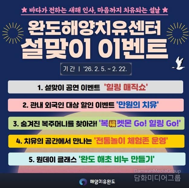시민행정신문 강갑수 기자 | 완도군은 설 명절을 맞아 귀성객, 군민, 관광객이 그동안 쌓인 피로를 풀고 활력을 얻을 수 있도록 ‘완도해양치유센터, 설맞이 힐링 이벤트’를 2월 5일부터 22일까지 운영한다.