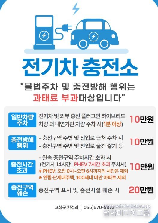 시민행정신문 강갑수 기자 | 고성군은 ‘환경친화적 자동차의 요건 등에 관한 규정’ 개정을 반영한 전기차 충전 방해행위에 대한 주민신고제 기준을 강화해 이달 2월 5일부터 시행한다.
