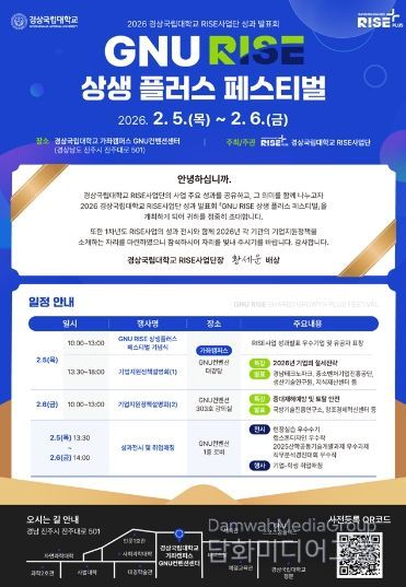 시민행정신문 강갑수 기자 | 경상국립대학교 라이즈(RISE) 사업단(단장 황세운)은 2월 5~6일 가좌캠퍼스 GNU 컨벤션센터 대강당 일원에서 RISE사업의 1차 연도 성과발표회 및 기업지원정책 설명회 ‘GNU RISE 상생 플러스 페스티벌’을 개최한다.