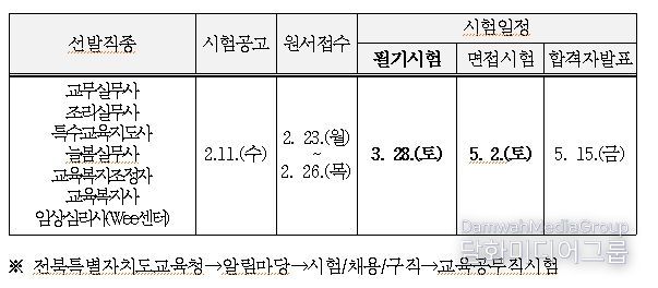노경숙 노사협력과장은 “11일 안내되는 공고에는 직종별 채용인원, 자격요건 및 세부 일정 등 구체적 내용이 포함된다”며 “교육공무직원 시험을 준비하는 응시자는 전북교육청 누리집에서 반드시 확인해주길 바란다”고 말했다.