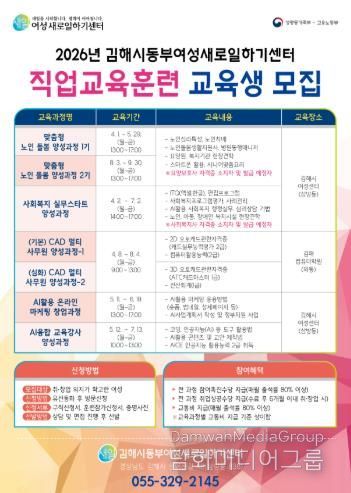 시민행정신문 강갑수 기자 | (재)김해시복지재단 동부여성새로일하기센터는 여성들의 취·창업 역량을 강화하고 지역사회의 특성과 시대적 흐름에 맞춘 여성 특화 직업교육훈련 과정의 교육생을 지난 2일부터 모집한다고 밝혔다.