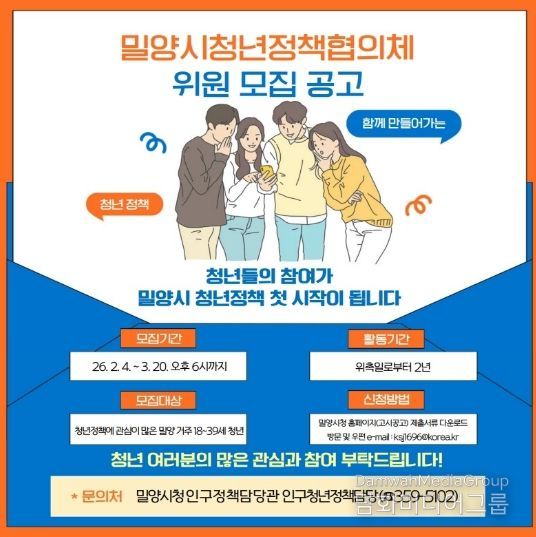 시민행정신문 강갑수 기자 | 경남 밀양시는 오는 3월 20일까지 시정의 주역으로서 청년 문제를 논의하고 정책을 직접 발굴·제안할 청년정책협의체 구성원을 모집한다.