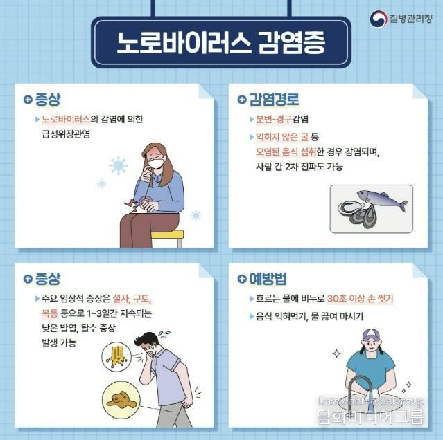 주요 감염 경로는 노로바이러스에 오염된 어패류 섭취이며, 특히 겨울철 제철 음식인 굴, 조개 등을 생으로 먹거나 충분히 익히지 않고 섭취할 경우 감염 위험이 높다.