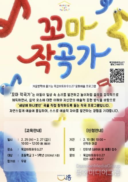 관내 거주하는 초등학생 3학년~5학년이라면 누구나 무료로 참여할 수 있다. 참여 신청은 2월 10일 10시부터 목감아트하우스27 또는 시흥문화예술 소통누리망(블로그ㆍ인스타그램)을 통해 가능하며 선착순으로 마감된다.