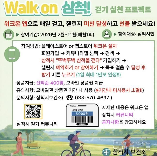 시민행정신문 기자 | 삼척시는 시민들의 건강 증진과 일상 속 걷기 실천율 향상을 위해 모바일 걷기 앱 '워크온(Walk On)'을 활용한 ‘워크온 걷기 챌린지’를 오는 2월부터 11월까지 운영한다.