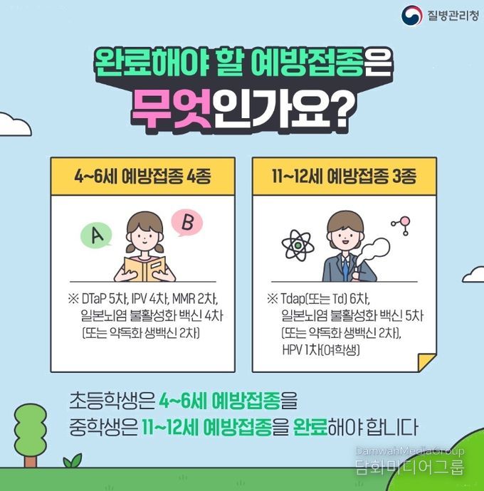 필수 예방접종 항목은 초등학생의 경우 △DTaP 5차 △IPV 4차 △MMR 2차 △일본뇌염 4차이며, 중학생의 경우 △Tdap 6차 △일본뇌염 5차 △HPV 1차다.