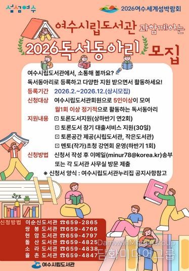 시 관계자는 “독서동아리는 책을 통해 시민들이 자연스럽게 연결되는 건강한 문화 활동”이라며 “여수 곳곳에서 책으로 이어진 작은 공동체들이 도시의 문화 경쟁력을 높이는 기반이 되길 기대한다”고 말했다.