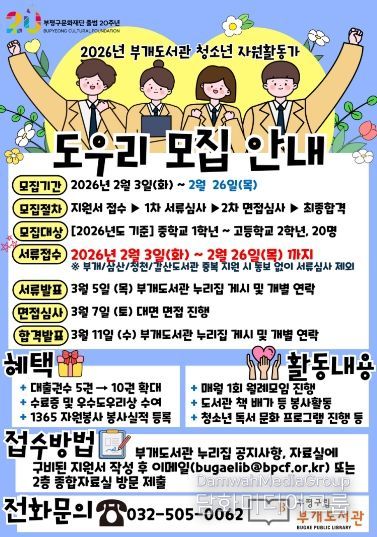 시민행정신문 강갑수 기자 | 부평구립 부개도서관은 오는 26일까지 청소년 자원활동가 ‘도우리’를 모집한다.